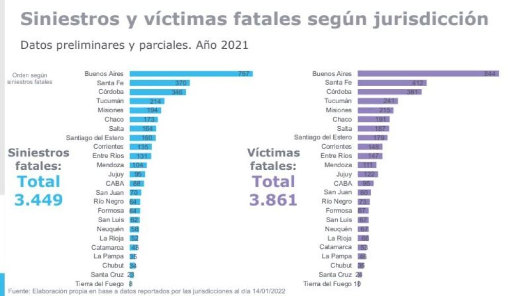 Las cifras oficiales publicadas por el Observatorio Vial de la ANSV, detallan que las jurisdicciones provinciales y CABA tuvieron la siguiente cantidad de fallecidos durante 2021: