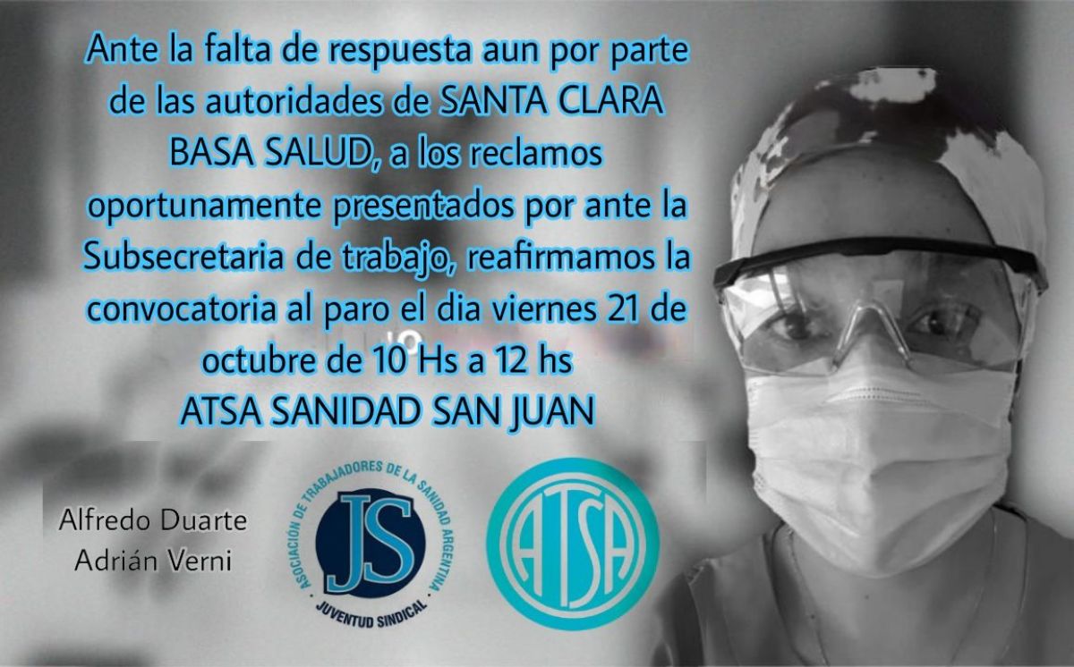 Los trabajadores de ATSA expresaron en el comunicado: “Ante la falta de respuesta por parte de las autoridades de Santa Clara Basa Salud, a los reclamos oportunamente presentados ante la Subsecretaría de Trabajo, reafirmamos la convocatoria al paro el día viernes 21 de octubre de 10 a 12 horas”.
