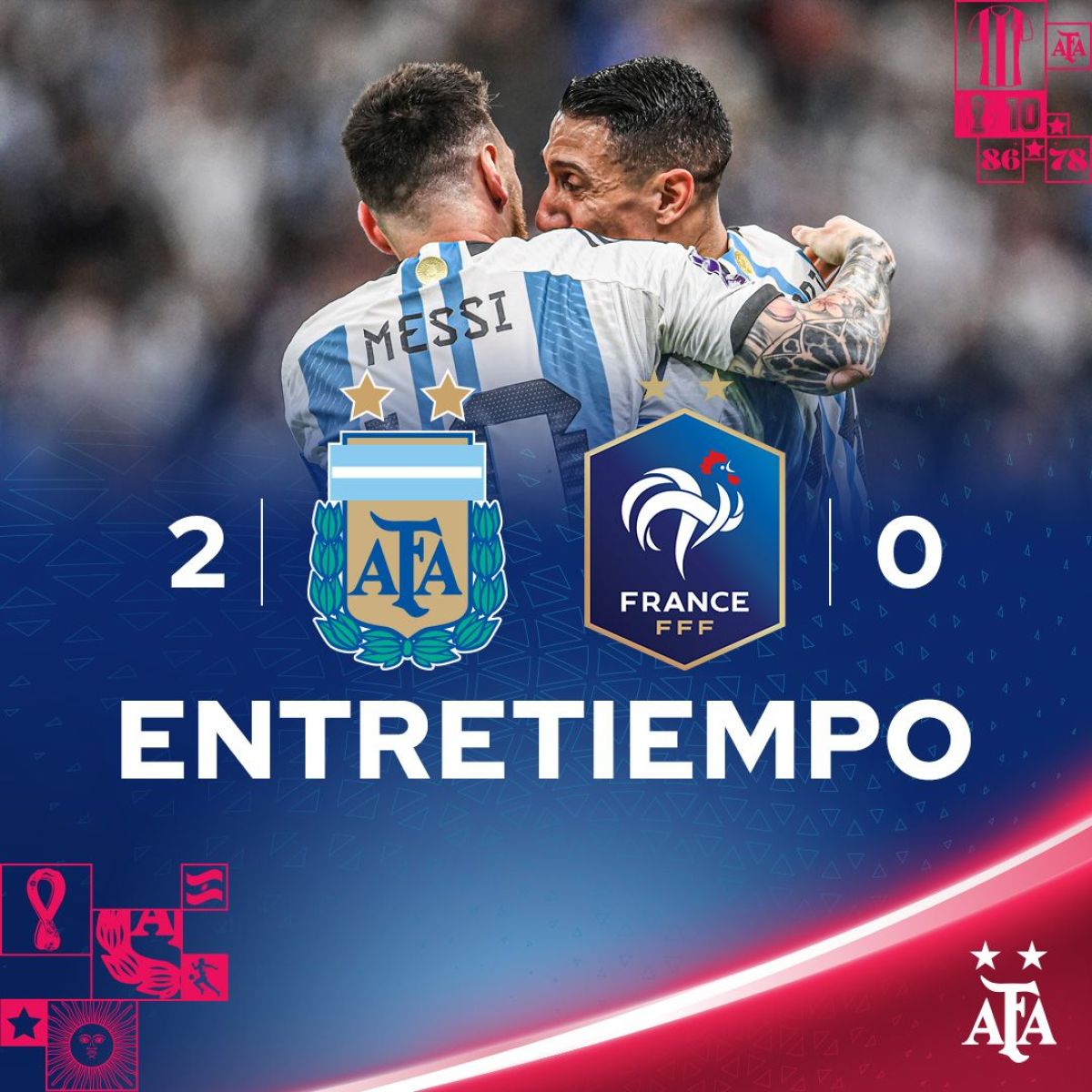 Un primer tiempo soñado en la final del mundial para la selección argentina. Se impone 2 a 0 frente a los galos que no han tenido llegadas al arco que defiende el Dibu Martínez.