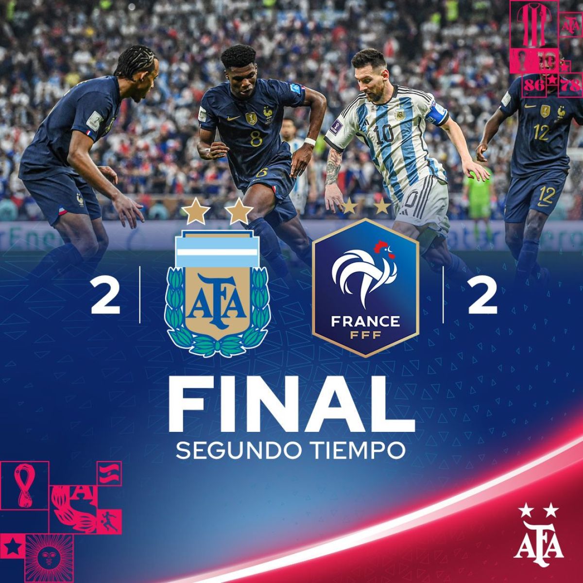 Increíblemente, Argentina tenía el partido dominado y controlado, pero Francia se repuso con dos ataques punzantes, levantó el 2-0 abajo para empatar el partido, y forzó el tiempo extra. Máxima tensión.En desarrollo...