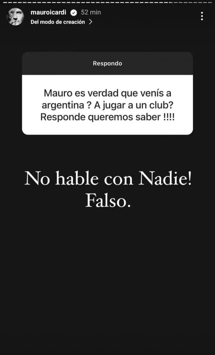 A través su cuenta de InstagramMauro se refirió a estos comentarios y fue lapidario. Para no jugar con la ilusión, fue categórico. “¡No hablé con nadie! Falso”, respondió el futbolista a una de las consultas.