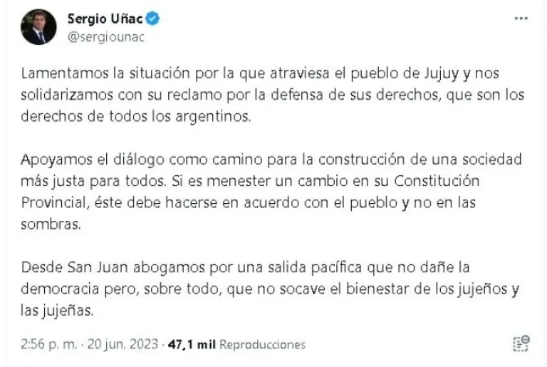 A través de su cuenta de Twitter, el gobernador Sergio Uñac dijo que lamenta lo sucedido en Jujuy y que se solidariza con el reclamo por la defensa de sus derechos. Esto en marco de la situación de violencia que atraviesa esa provincia, como consecuencia la nueva Constitución de la provincia.