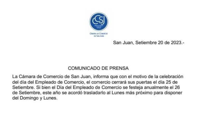 En un comunicdo de prensa la Cámara de Comercio de San Juan anunció hoy que, en conmemoración del Día del Empleado de Comercio, los establecimientos comerciales en la ciudad permanecerán cerrados el próximo 25 de septiembre. Aunque tradicionalmente esta fecha se celebra el 26 de septiembre, este año se ha decidido trasladar la festividad al lunes más cercano, permitiendo a los empleados disfrutar de un fin de semana extendido con el domingo y el lunes libres.