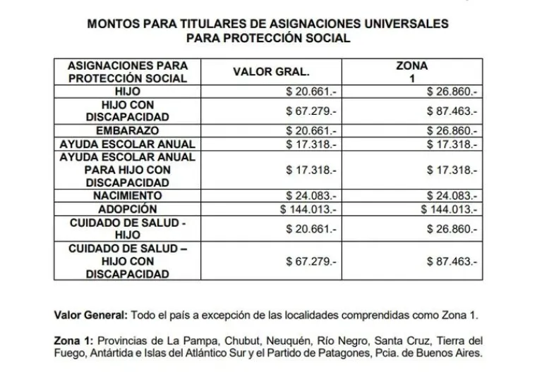 Cabe destacar que las personas que residen en las provincias de La Pampa, Chubut, Neuquén, Río Negro, Santa Cruz, Tierra del Fuego, Antártida e Islas del Atlántico Sur y el Partido de Patagones, provincia de Buenos Aires, cuentan con un cuadro diferencial de montos mensuales.