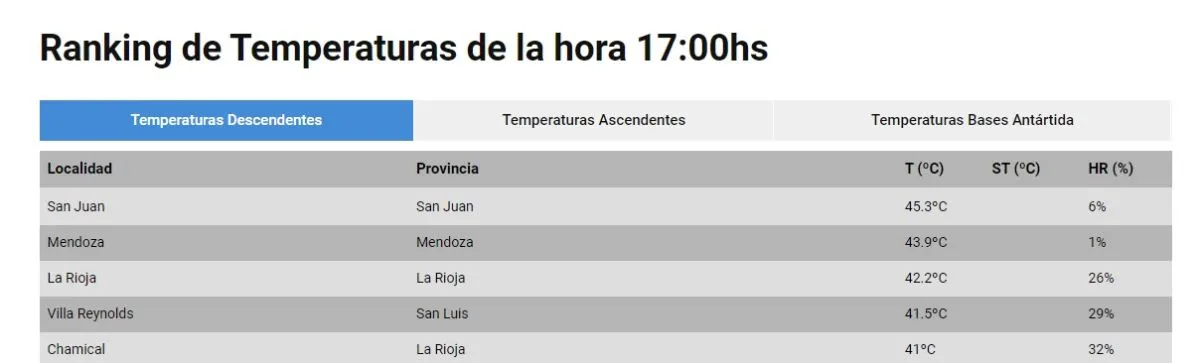 Desde el mediodía, la ciudad de San Juan está en el primer puesto de ciudades del país con la temperatura más alta. Al mediodía ya se habían alcanzado los 40 grados.