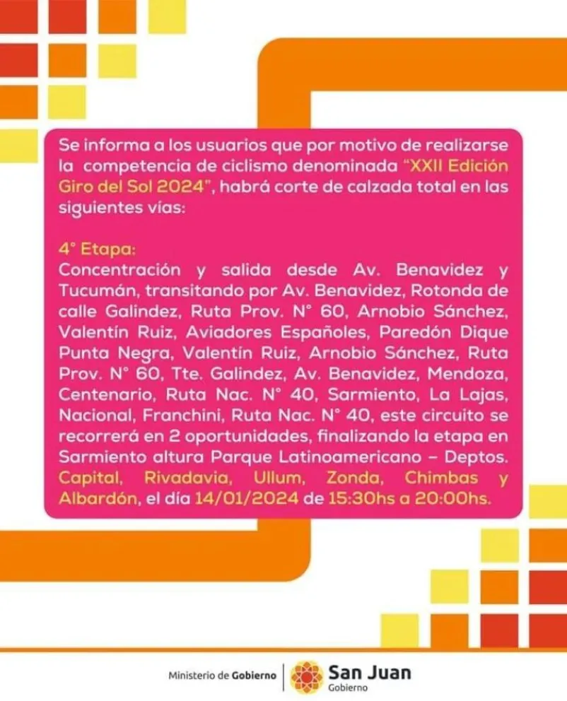 Este domingo, se disputará la última etapa del Giro del Sol. Los ciclistas recorrerán distintos puntos de la provincia y desde el sitio oficial de la Red Tulum brindaron un detalles sobre las líneas que estarán afectadas.