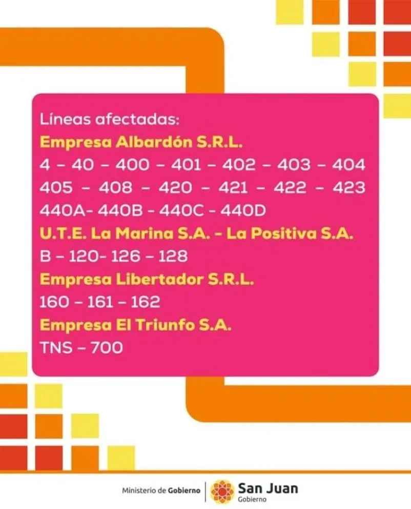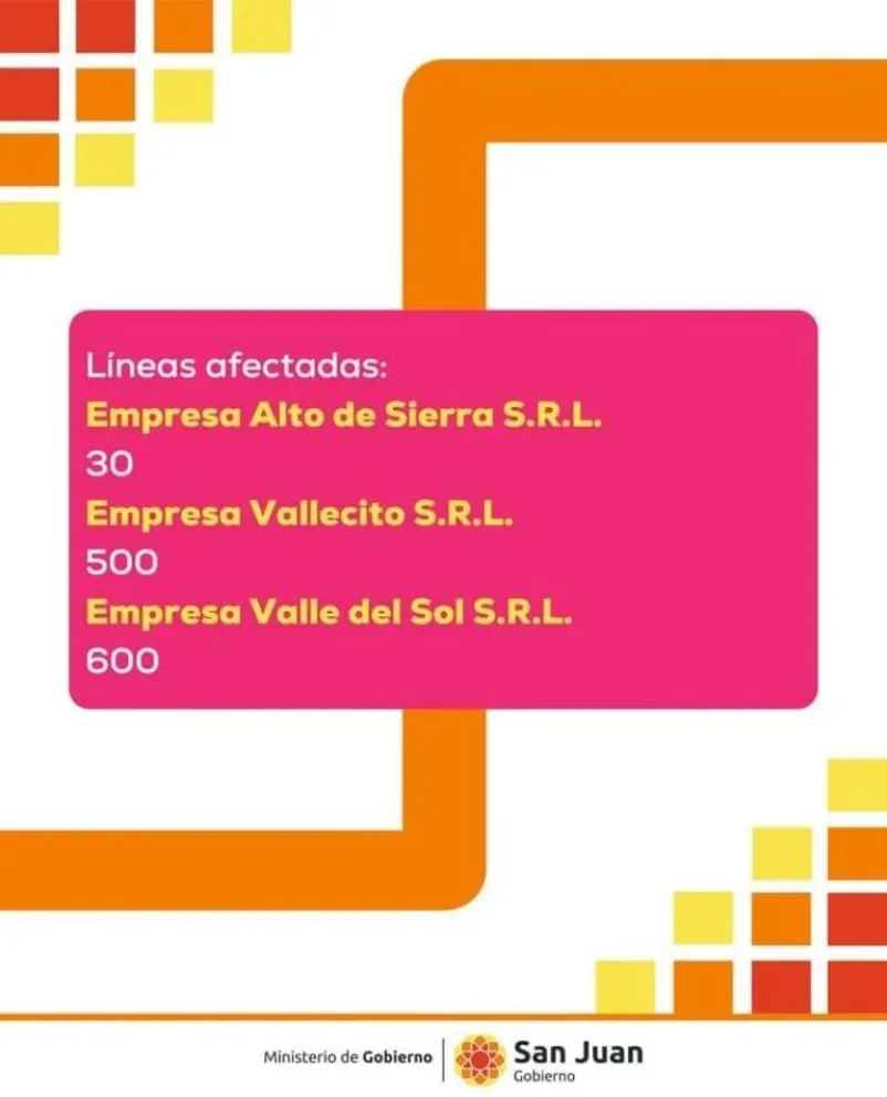 "Los recorridos de varias líneas de colectivos se verán momentáneamente afectadas en los departamentos de Capital, Rivadavia, Ullum, Zonda, Chimbas y Albardón", detallaron.