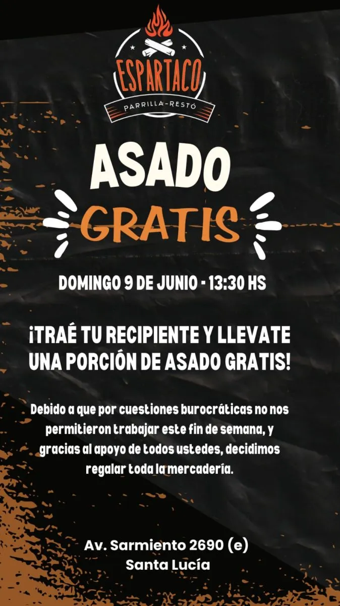 Espartaco, es un local ubicado en calle Sarmiento 2690 este, en el departamento de Santa Lucía. Su dueño, contaba con la esperanza de poder abrir este fin de semana, pero al no poder hacerlo, decidieron regalar comida. Es decir, mañana domingo, a partir de las 13:30 horas, se entregará una porción de asado por persona en la puerta de local.