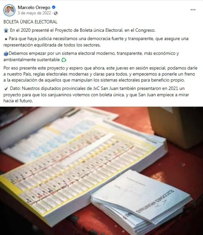 Proyecto. Orrego había publicado en sus redes sociales que había presentado su proyecto de boleta única en el Congreso.