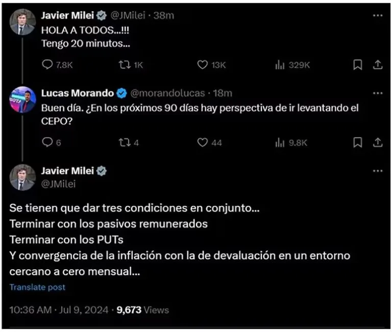 “Buen día. ¿En los próximos 90 días hay perspectiva de ir levantando el Cepo?”, preguntó el periodista Lucas Morando. Al respecto, Milei respondió: “Se tienen que dar tres condiciones en conjunto... Terminar con los pasivos remunerados, Terminar con los PUTs y convergencia de la inflación con la de devaluación en un entorno cercano a cero mensual…”.
