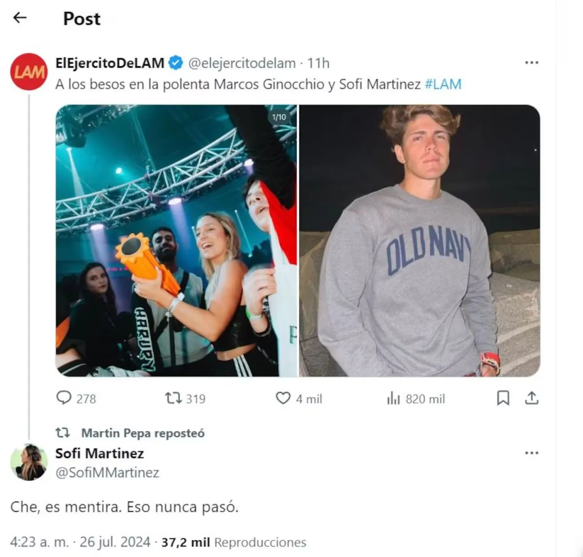Activa en X (ex Twitter), Sofi no dejó pasar el tema y aclaró los tantos con contundencia: “Che, es mentira. Eso nunca pasó”.