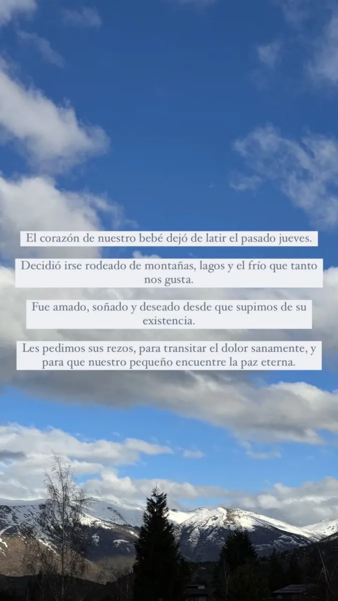 “El corazón de nuestro bebé dejó de latir el pasado jueves. Decidió irse rodeado de montañas, lagos y el frío que tanto nos gusta. Fue amado, soñado y deseado desde que supimos de su existencia”, escribió Marisol en sus historias.