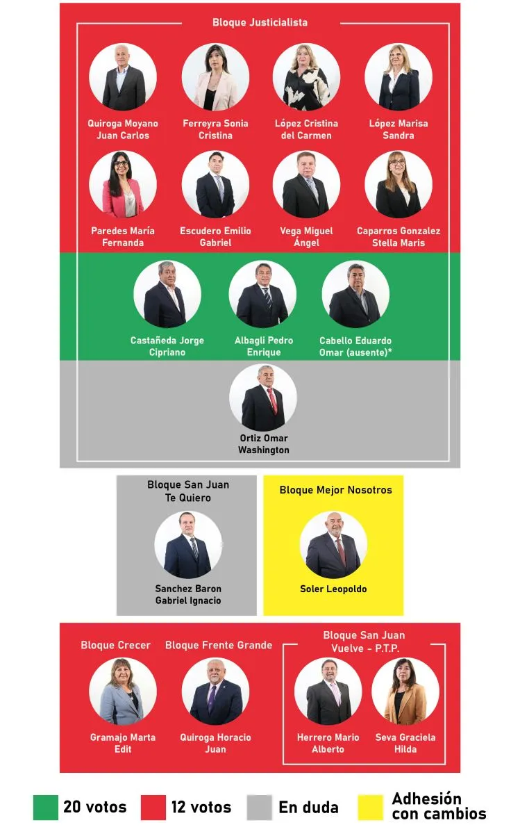 Sobre las cuentas finales, el orreguismo, gracias al bloquismo, el Frente Renovador, La Libertad Avanza, el Bloque del Este y diputados del PJ, suma 20 votos a favor. La oposición acumula 12 bancas de rechazo, mientras que Soler, de Ullum, confirmó que sostendrá su dictamen.