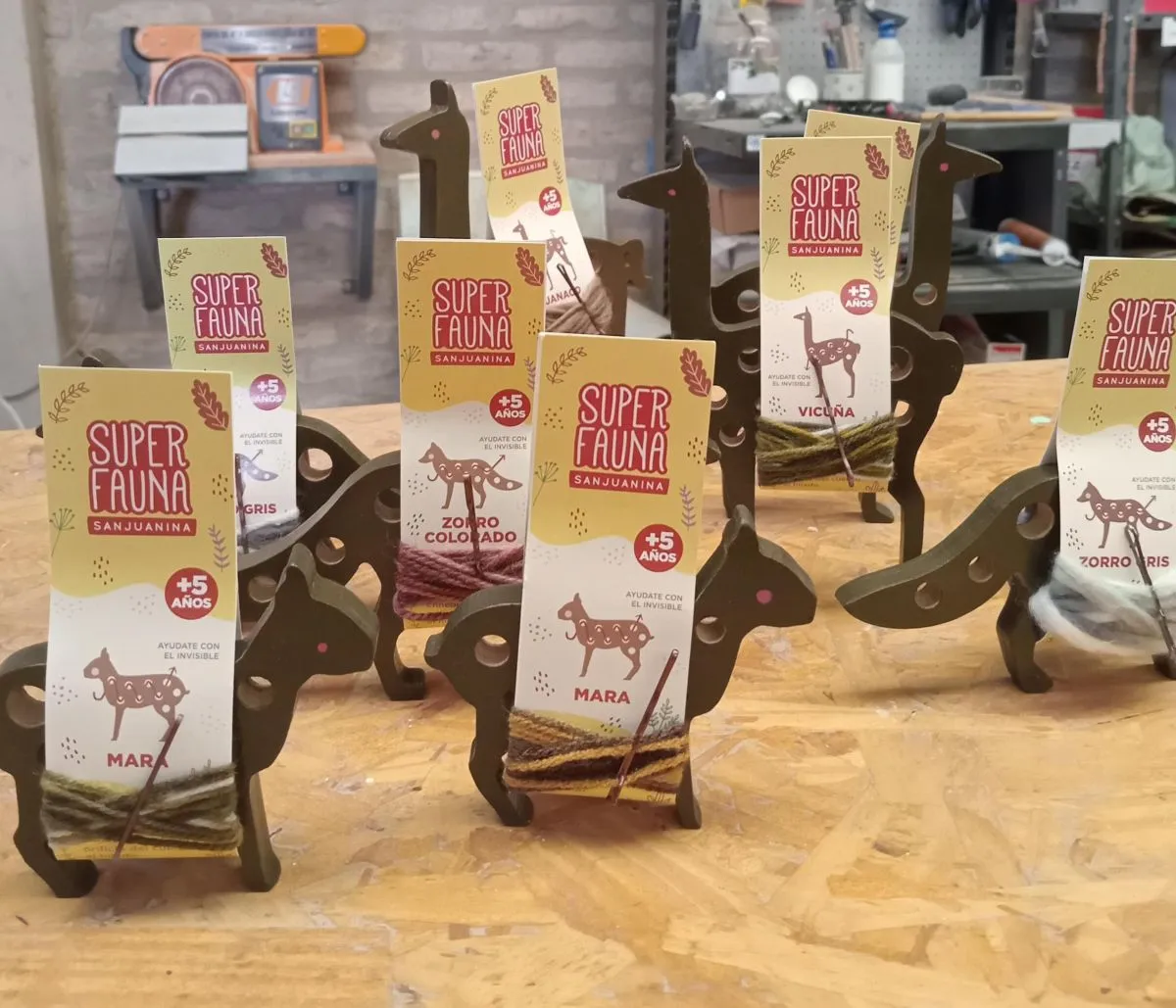 De esta manera dio lugar a su línea de juguetes artesanales que tienen una característica particular: sus diseños están inspirados en animales autóctonos. “Tengo juguetes didácticos que se llaman “Súper Fauna Sanjuanina”, donde aparecen figuras de animales de la fauna regional como guanacos, vicuñas, zorro colorado, zorro gris, mara, entre otros. Son juegos para enhebrar”, contó.