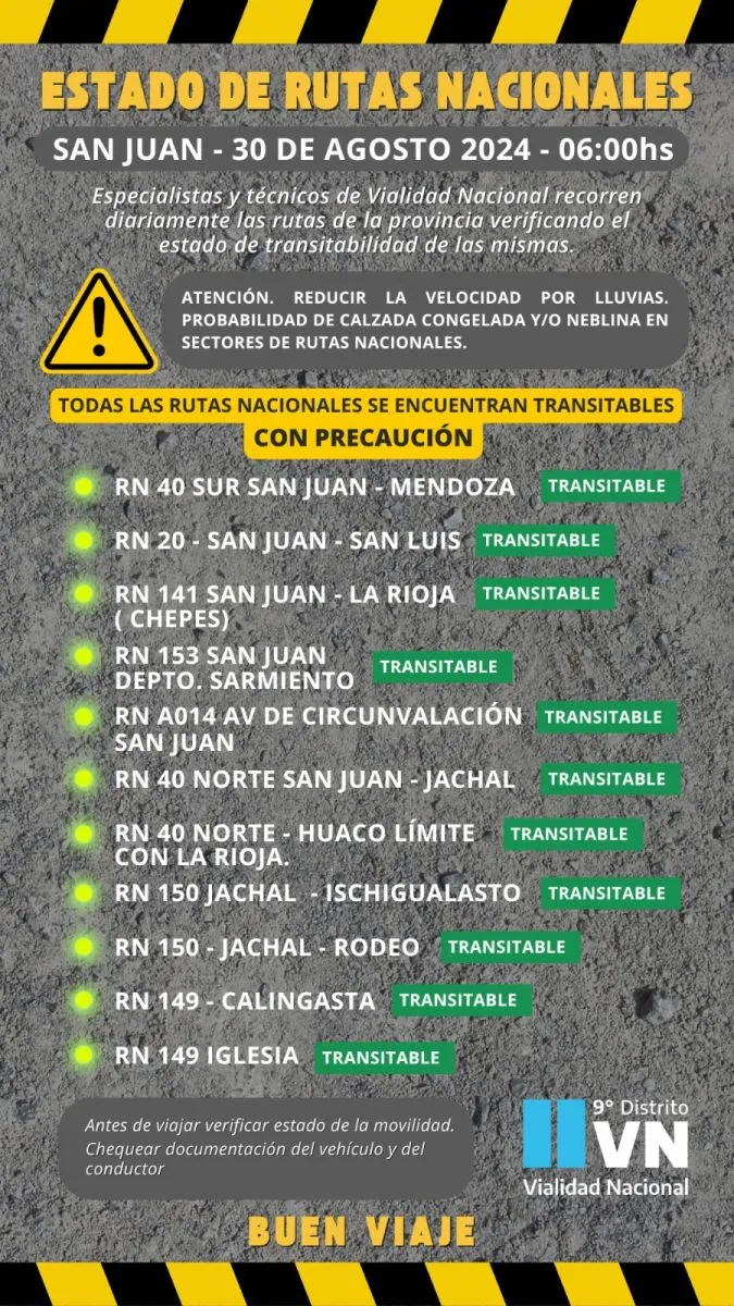 Las condiciones climáticas adversas registradas este viernes en la provincia de San Juan han generado complicaciones en la circulación de algunas rutas, según informaron las autoridades de Vialidad. Debido a las nevadas, se recomienda a los conductores transitar con extrema precaución en la Ruta 149 de Calingasta, especialmente en la zona de La Quebrada, donde la acumulación de nieve puede dificultar el desplazamiento.