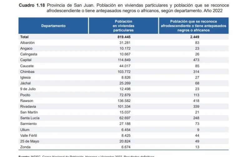 Para la época en la que se realizó el censo, en San Juan habitaban 2.449 personas que se reconocían como afrodescendientes, de las cuales 1.254 son mujeres y 1.195, varones.