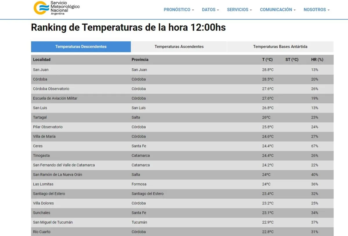 Sobre el mediodía de este lunes y con 28.8°, San Juan estuvo en el primer lugar del ranking a las 12 del mediodía.