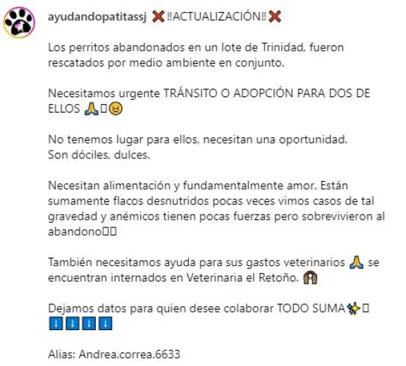 Las proteccionistas están buscando personas que puedan ofrecer un hogar transitorio o, en el mejor de los casos, adopción responsable. Quienes deseen colaborar con esta causa, pueden hacerlo a través de las redes sociales de la asociación Ayudando Patitas SJ.