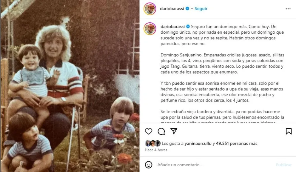 Barassi también expresa su profunda nostalgia al recordar a su madre, mencionando cómo, aunque ya no puede estar físicamente presente de la misma manera, el amor y los momentos compartidos siguen vivos en su memoria. "Se te extraña vieja bardera y divertida, ya no podrías hacerme upa por la salud de tus piernas, pero hubiésemos encontrado la manera de ser hijo y madre desde otro lugar como hicimos siempre", escribió.