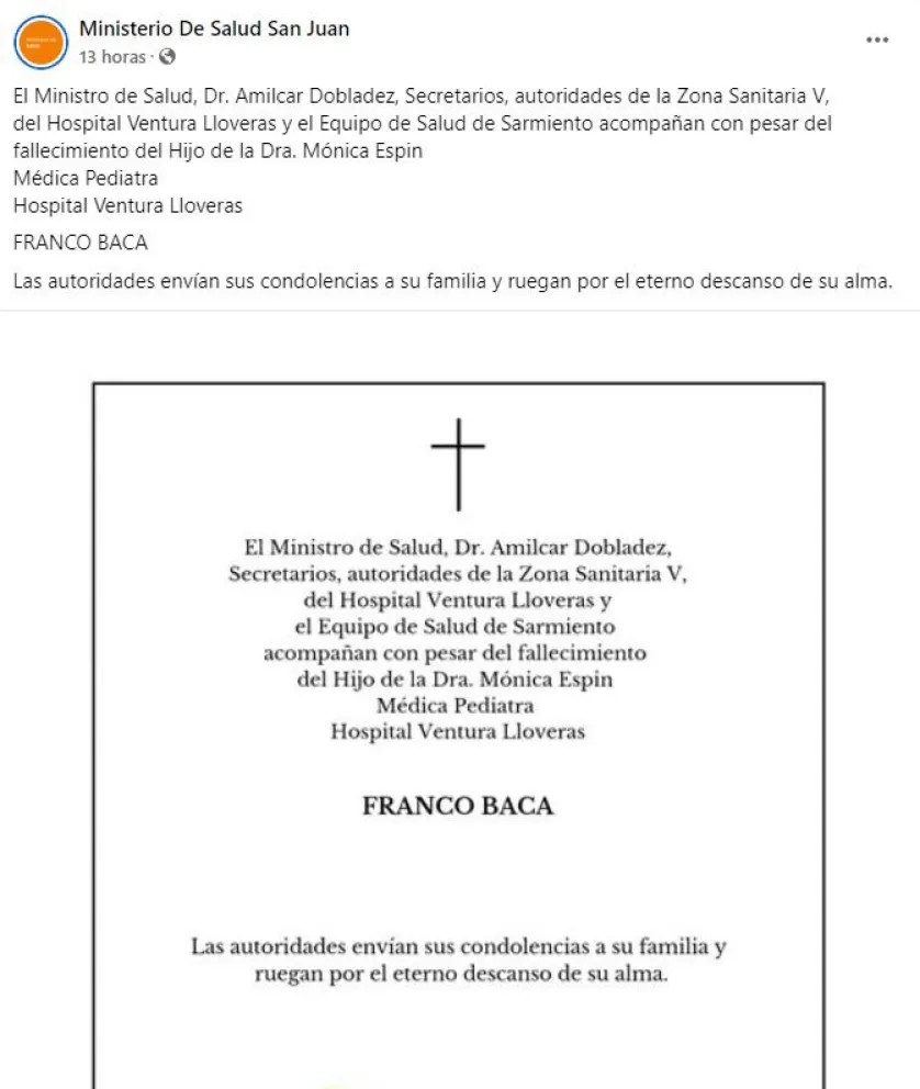 Asimismo, el Ministerio de Salud también se sumó a las muestras de condolencias, extendiendo su apoyo a la familia de la doctora Mónica Espin, quien es madre de Franco y trabaja como médica pediatra en el Hospital Ventura Lloveras. En su comunicado, el ministro de Salud, Dr. Amilcar Dobladez, junto con las autoridades del Hospital y el Equipo de Salud de Sarmiento, expresó: "Acompañamos con pesar el fallecimiento del hijo de la Dra. Mónica Espin. Enviamos nuestras condolencias a su familia y rogamos por el eterno descanso de su alma".