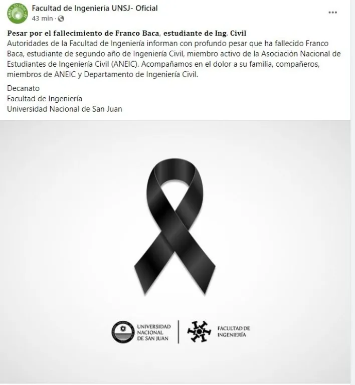"Las autoridades de la Facultad de Ingeniería informan con profundo pesar que ha fallecido Franco Baca. Acompañamos en el dolor a su familia, compañeros, miembros de ANEIC y Departamento de Ingeniería Civil", reza el comunicado oficial.