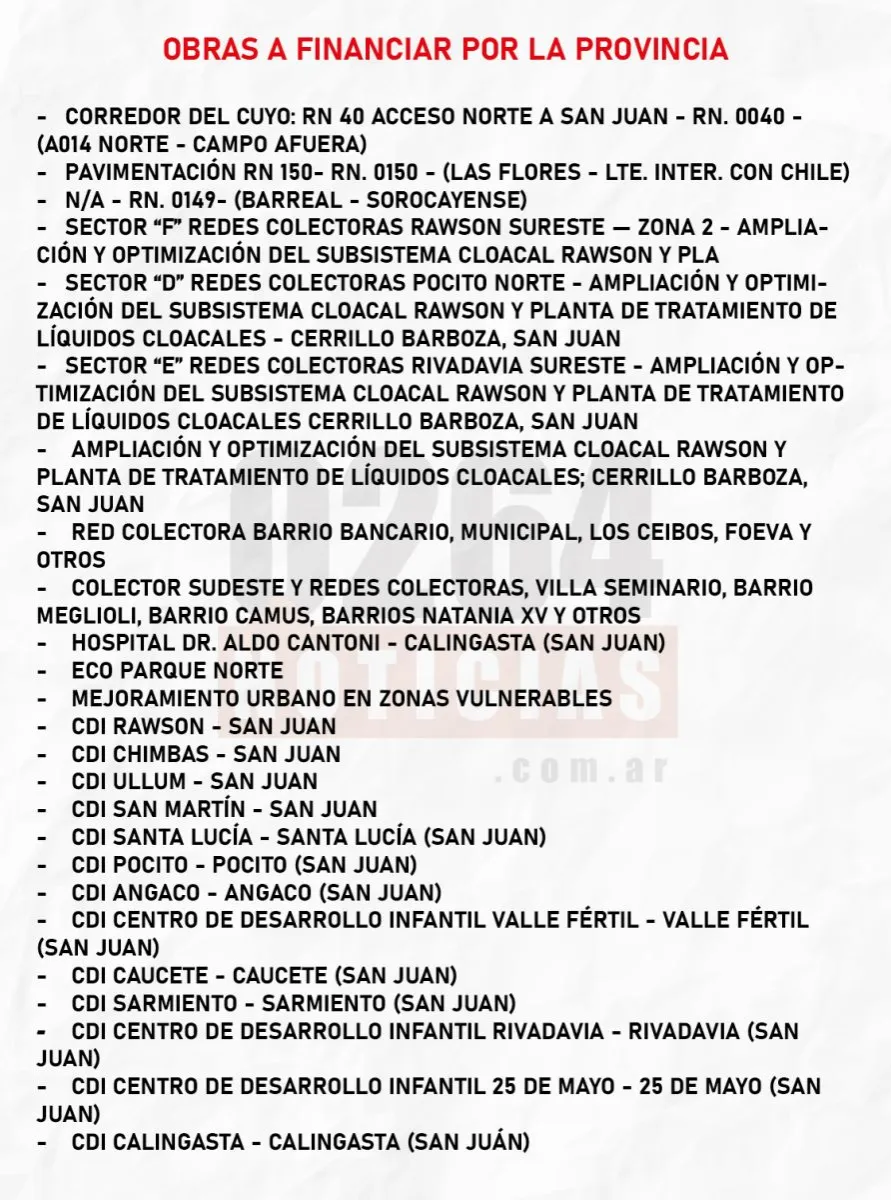 Los trabajos a realizar están ubicados en San Martín, Calingasta, Angaco, Pocito, 9 de Julio, Valle Fértil, 25 de Mayo, Caucete e Iglesia. Departamentos que son comandados por intendentes justicialistas, a excepción del último, que es conducido por un bloquista.
