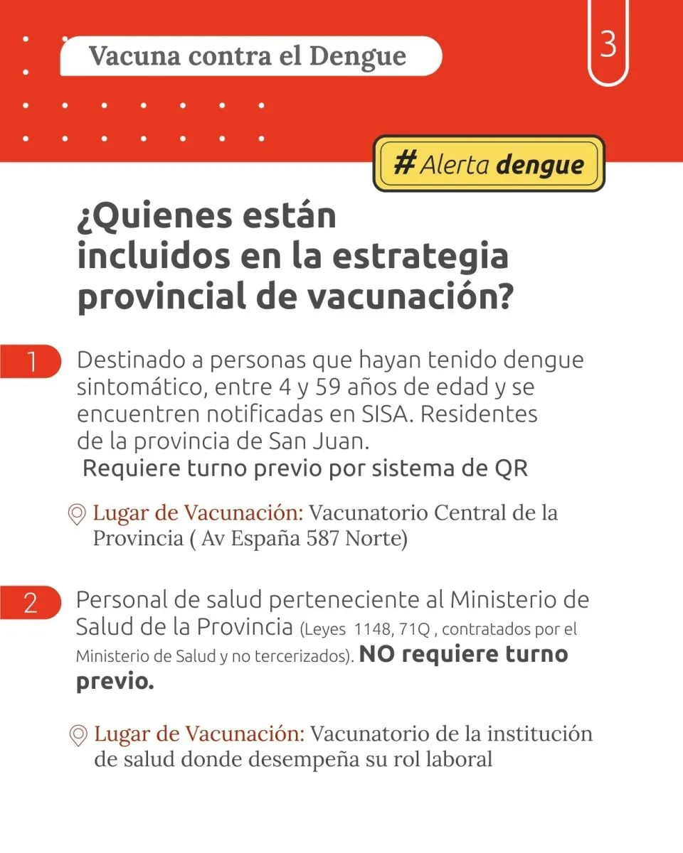 "La población general que haya padecido dengue sintomático, que tenga entre 4 y 59 años y que resida en San Juan, deberá anotarse para recibir las dosis", anunció la jefa de Epidemiología del Ministerio de Salud, Liliana Bertoni.