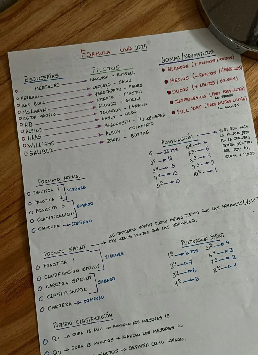 “Me dio ternura mi novia intentando aprender de F1 así que le hice esto para que pueda entender lo básico. Tenés un muy buen novio, @flor_biasone”, posteó Tomás en su cuenta de X, junto al papel en donde le explicó cada detalle.