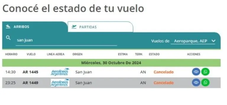 Los vuelos de Aerolíneas Argentinas aparecen como cancelados, mientras que el de Flybondi, que despega este mediodía desde Buenos Aires, hasta ahora, aparece en horario y sin modificaciones.