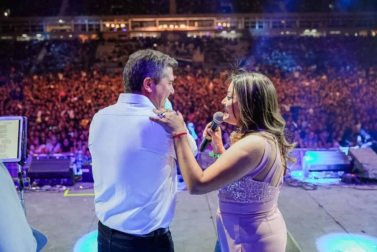 El gobernador Marcelo Orrego cantó junto a la artista Giselle Aldeco en el escenario mayor del Estadio del Bicentenario.