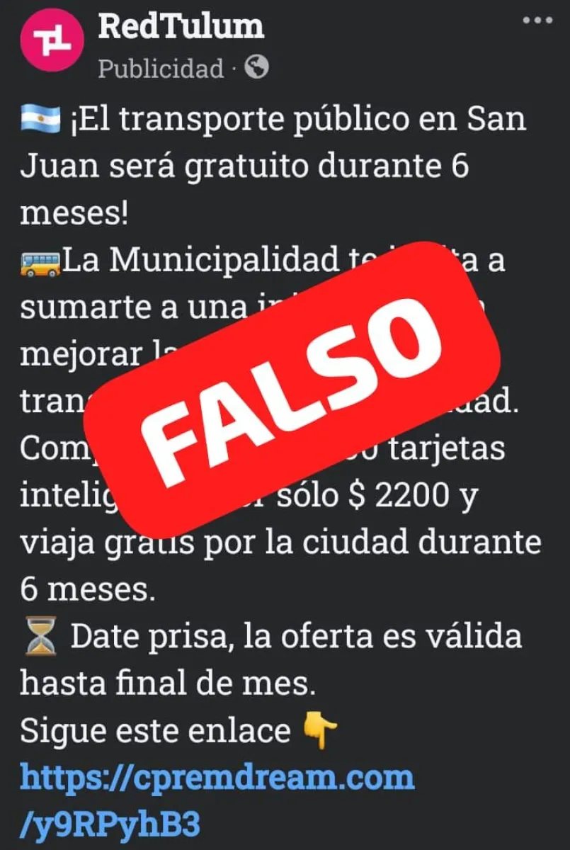 Este martes, las autoridades de Tránsito y Transporte de San Juan emitieron un comunicado alertando a la población sobre una nueva estafa que circula a través de las redes sociales. Según la publicación falsa, los usuarios podían viajar gratis durante seis meses en el sistema de transporte público sanjuanino si adquirían una tarjeta SUBE. La oferta, que rápidamente se hizo viral en Facebook, resultó ser completamente engañosa.