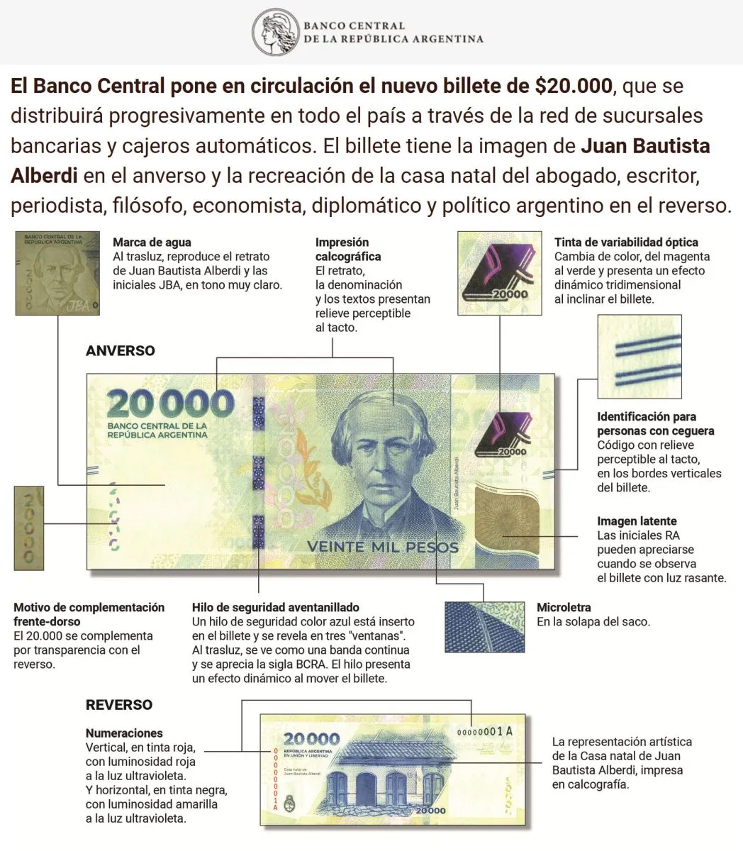 “Este billete completa la familia ‘Heroínas y Héroes de la Patria’ creada en 2022. El anverso del billete presenta la imagen de Juan Bautista Alberdi, inspirador de la Constitución Nacional de 1853. El reverso ilustra la recreación de la casa natal del abogado, escritor, periodista, filósofo, economista, diplomático y político argentino”, explicó la autoridad monetaria.