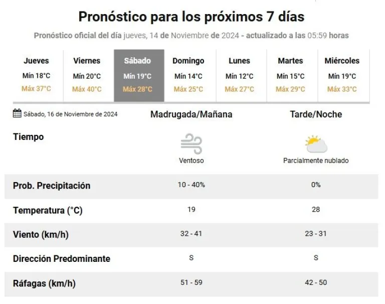Para el sábado se espera una temperatura mínima de 19° y una máxima de 28°, con probabilidad de precipitaciones por la mañana y ráfagas de viento sur de hasta 60 kilómetros por hora en la primera parte de la jornada y de hasta 50 km/h.