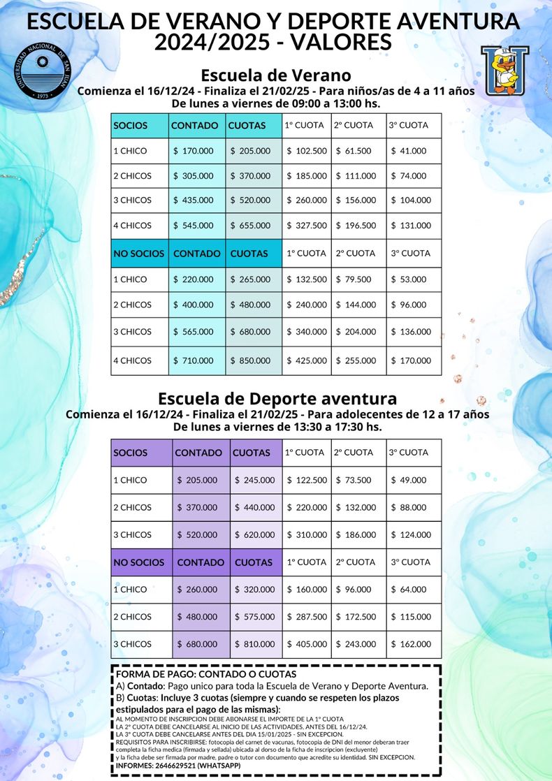 Opciones:  Escuela de Verano (4 a 11 años): $170.000 para socios y $220.000 para no socios.