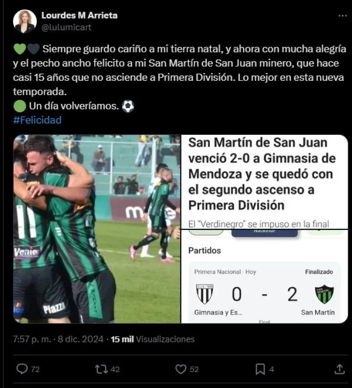 "Siempre guardo cariño a mi tierra natal, y ahora con mucha alegría y el pecho ancho felicito a mi San Martín de San Juan minero, que hace casi 15 años que no asciende a Primera División. Lo mejor en esta nueva temporada", reza el posteo en su cuenta de "X".