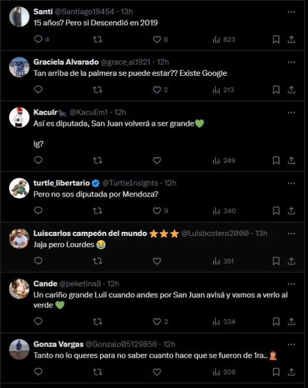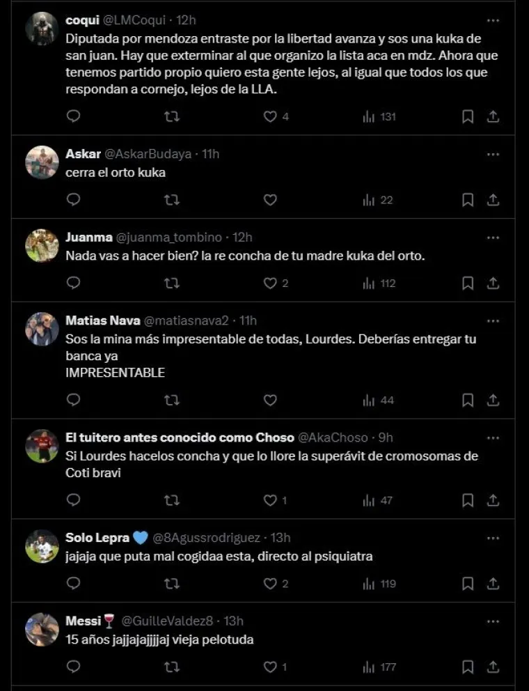 Algunos mensajes de los ciudadanos de la vecina provincia la califican como "traidora" y la acusaban de "robar una banca de La Libertad Avanza" por Mendoza. Asimismo, la invitaban a dejar su banca y representar a San Juan.