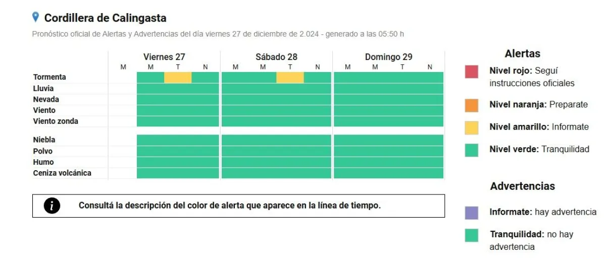 Es que el Servicio Meteorológico Nacional informó que rige un alerta por tormentas con lluvias y granizo para Calingasta tanto para la tarde de este viernes como para la tarde del sábado.
