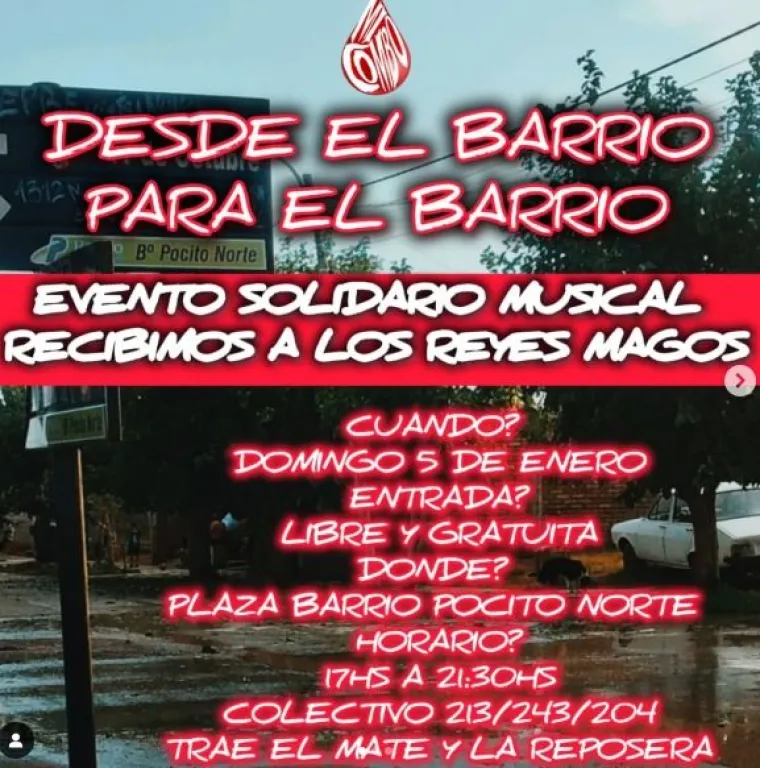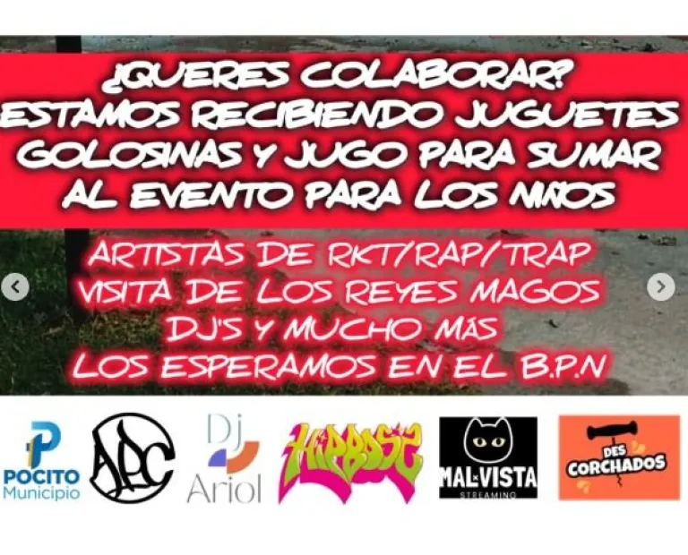 Este domingo 5 de enero, el grupo musical Mi Combo RKT llevará a cabo la primera edición de su evento solidario "Desde el barrio para el barrio", una jornada destinada a celebrar el Día de Reyes con los niños de Pocito Norte. De 17 a 21:30 horas, la Plaza del barrio será el escenario para una tarde de música, regalos y sorpresas, con la participación de conocidas bandas locales de diversos géneros.
