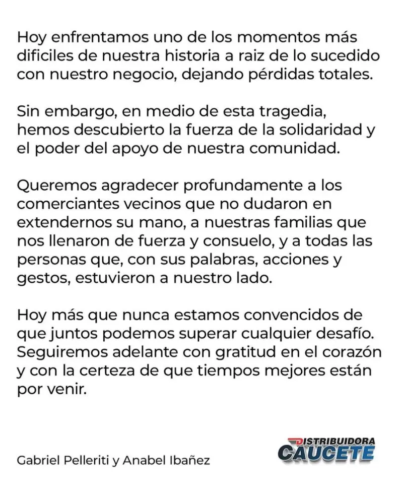 Tras dos días de lo sucedido, los propietarios, Gabriel y Anabel, compartieron su dolor y agradecieron la solidaridad de la sociedad a través de las redes sociales: "Hoy enfrentamos uno de los momentos más difíciles de nuestra historia a raíz de lo sucedido con nuestro negocio".
