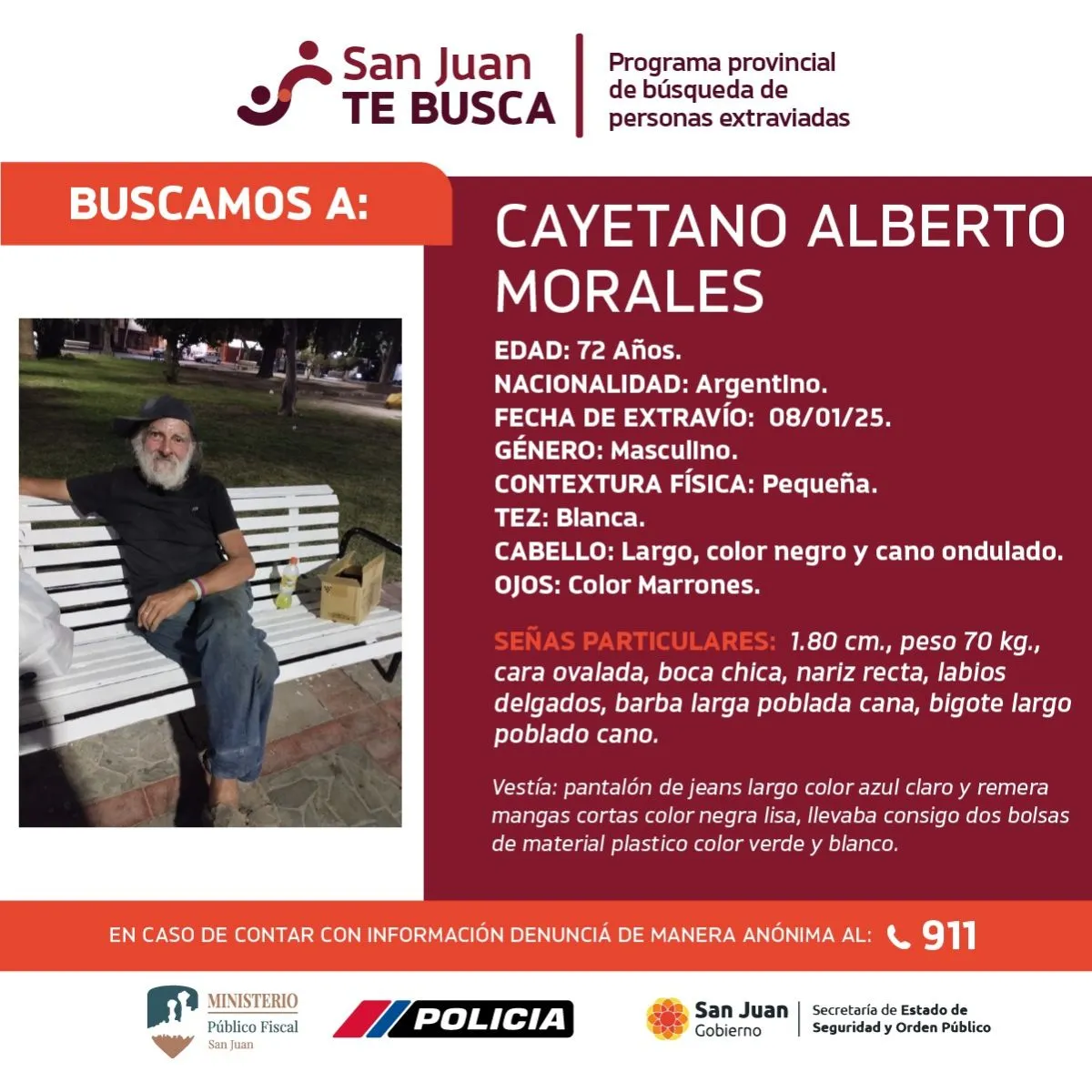 La persona desaparecida se llama Cayetano Alberto Morales y tiene 72 años de edad.  De acuerdo a la descripción compartida por la Policía, tiene contextura física pequeña, una tez blanca, cabello largo color negro y cano ondulado y ojos marrones.