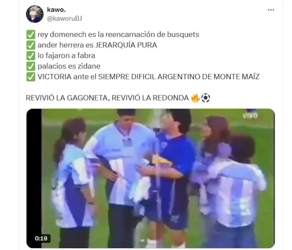 Como era de esperarse, las redes sociales ardieron con los clásicos memes. Los cibernautas apuntaron al gran debut del juvenil Rey Domenech, que fue una de las figuras con apenas 18 años. También el español Ander Herrera, que jugó el primer tiempo y mostró su clase.
