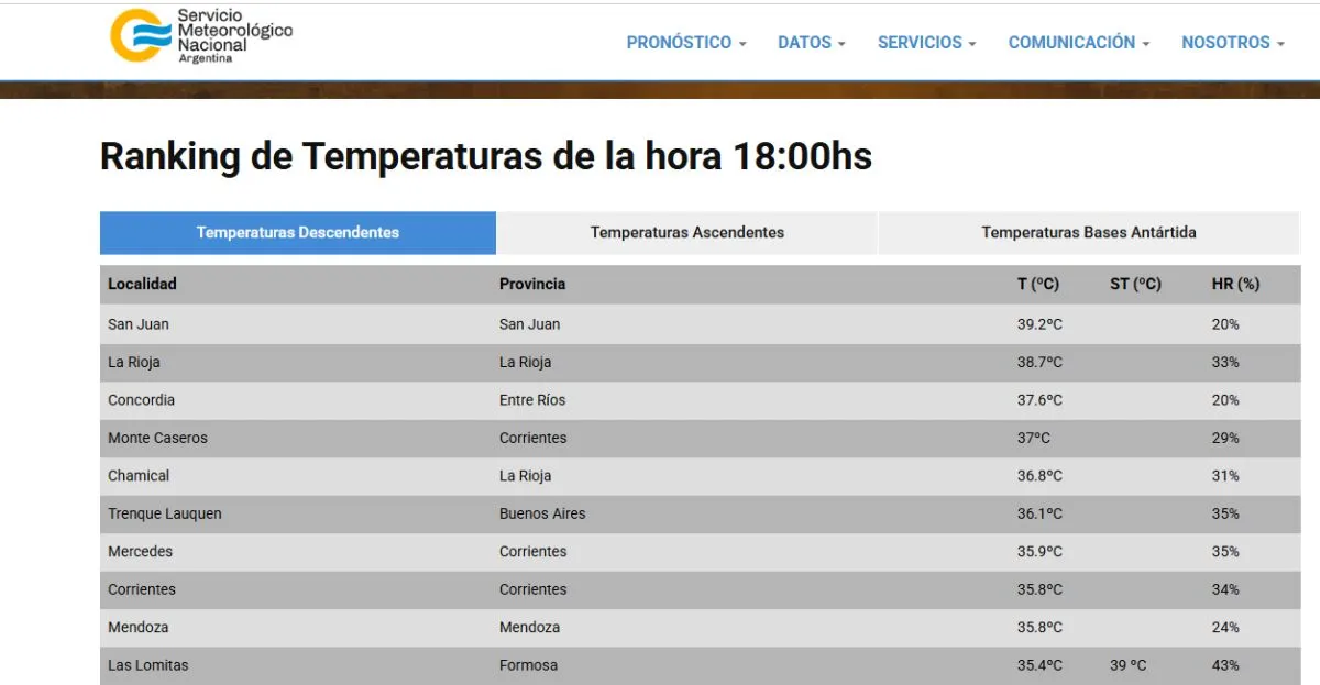 En este sentido, San Juan se ubica primero con 39.2 °C, luego está La Rioja con 38.7 °C, la localidad de Concordia de Entre Ríos con 37.6 °C, Monte Caseros en Corriente con 37 °C y Chamical en La Rioja con 36.8 °C.