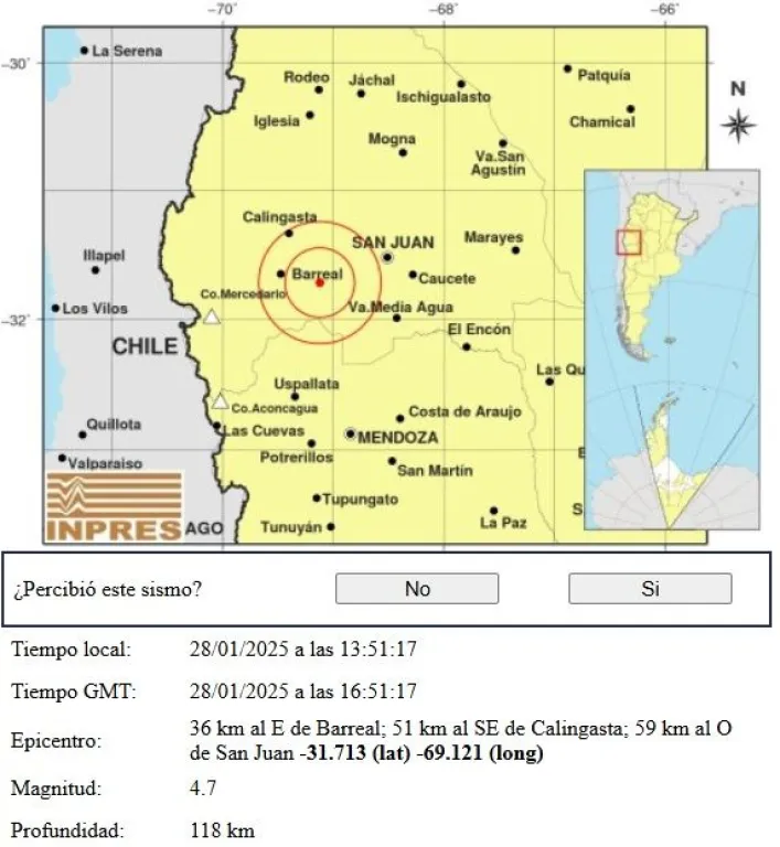 Según el Instituto Nacional de Prevención Sísmica (INPRES), el epicentro se ubicó a 36 kilómetros al este de Barreal, 51 kilómetros al sudeste de Calingasta y 59 kilómetros al oeste de la ciudad de San Juan. Por su parte, la profundidad fue de 118 kilómetros, lo que provocó que el temblor se sintiera con intensidad moderada en varios sectores.
