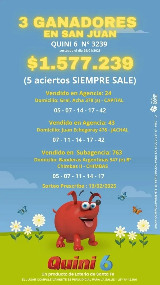 El sorteo número 3239, realizado el 29 de enero, dejó su huella en San Juan, donde los afortunados acertaron cinco de los números sorteados. El primer cartón ganador fue vendido en la Agencia 24, ubicada en General Acha 378 Sur, en la Capital, con los números 05-07-14-17-42. El segundo premio correspondió a una jugada vendida en la Agencia 43, en Juan Echegaray 478, en Jáchal, con los números 07-11-14-17-42. Finalmente, el tercer ganador se registró en la Subagencia 763, en Banderas Argentinas 547 Este, en Chimbas, con los números 05-07-11-14-17.