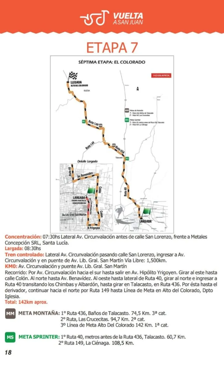 Recorrido: en tren controlado por Lateral Av. Circunvalación pasando calle San Lorenzo, ingresar a Av. Circunvalación y en puente de Av. Lib. Gral. San Martín Vía Libre: 1,500km. Kilómetro 0: Av. Circunvalación y puente Av. Lib. Gral. San Martín. Carrera continúa por Av. Circunvalación hacia el sur hasta salir en Av. Hipólito Yrigoyen retoma calle Pellegrini costado oeste hasta, hasta calle Colón. Al norte hasta Av. Benavídez. Al oeste hasta lateral de Ruta 40, girar al norte e ingresar a Ruta 40 transitando los Chimbas y Albardón, hasta girar en Talacasto, en Ruta 436. Por esta hasta el derivador, continuar hacia el norte por Ruta 149 hasta Línea de Meta en Alto del Colorado, Dpto. Iglesia.