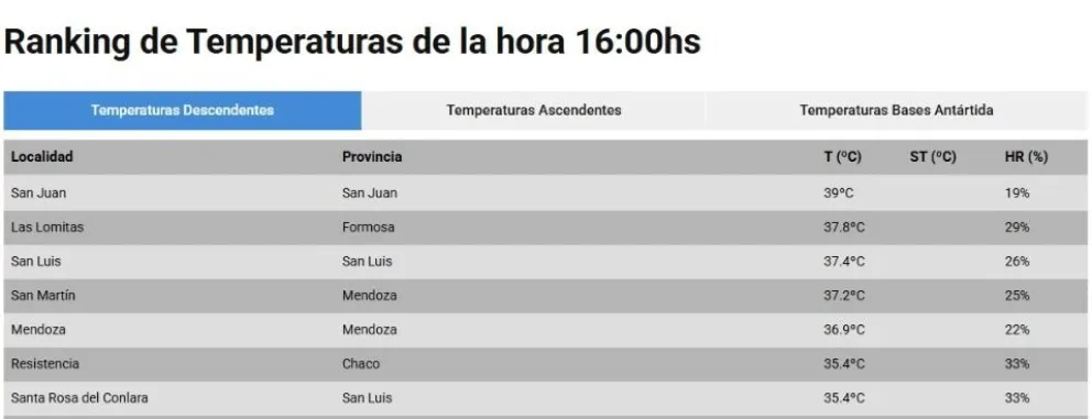 En el ranking elaborado por el Servicio Meteorológico Nacional se ubicó segunda la localidad formoseña de Las Lomitas con 37.8 grados y tercera, la provincia de San Luis con 37.4 grados.