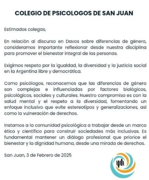 Ante estas afirmaciones, el Colegio de Psicólogos de San Juan expresó su preocupación y reafirmó su compromiso con la igualdad, la diversidad y la justicia social. "Exigimos respeto por la igualdad y la justicia social en la Argentina libre y democrática", señala el comunicado.