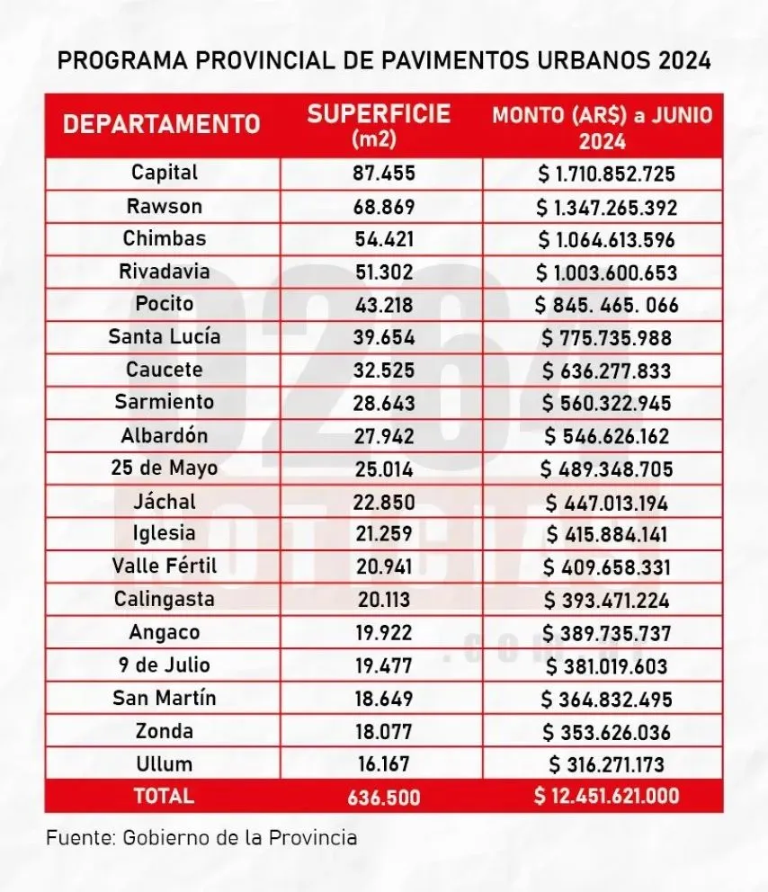 Para el caso del Grupo 4, el plazo de ejecución es de 360 días corridos, para pavimentar, en Rawson, unos 68.869 metros cuadrados, lo que representa unas 100 cuadras. Pocito tiene adjudicados 43.218 metros cuadrados, poco más de 60 cuadras, mientras que Santa Lucía figura con 39.654 metros cuadrados, unas 57 cuadras. A la comuna de Sarmiento se le asignó 28.643 metros cuadrados, lo que implica unas 40 cuadras en total.