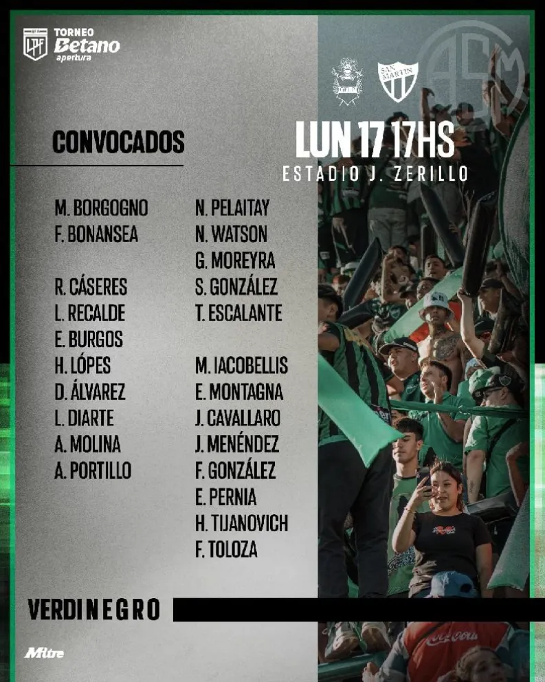 San Martín dio a conocer la lista de convocados para enfrentar a Gimnasia de La Plata (El Verdinegro en la fecha pasada ante Talleres de Córdoba)