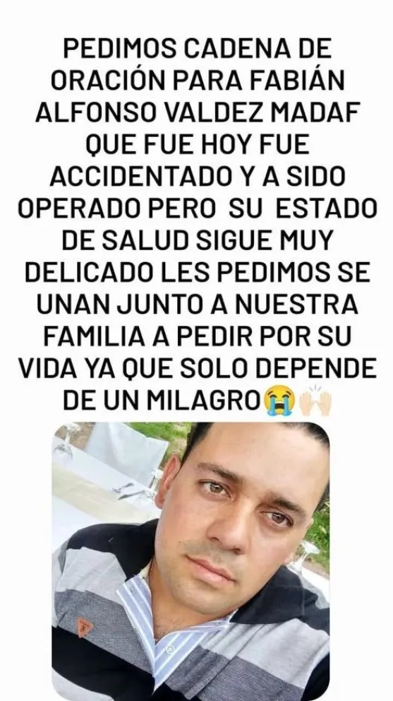 Familiares y amigos de Fabián Valdez Madaf Alonso piden cadenas de oración a través de las redes sociales, luego de que sufriera un brutal choque en Avenida Circunvalación, que lo dejó en estado crítico.